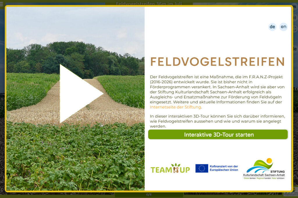 Der Feldvogelstreifen ist eine Maßnahme, die im F.R.A.N.Z-Projekt (2016-2025) entwickelt wurde. Sie ist bisher nicht in Förderprogrammen verankert. In Sachsen-Anhalt wird sie aber von der Stiftung Kulturlandschaft Sachsen-Anhalt erfolgreich als Ausgleichs- und Ersatzmaßnahme zur Förderung von Feldvögeln eingesetzt.